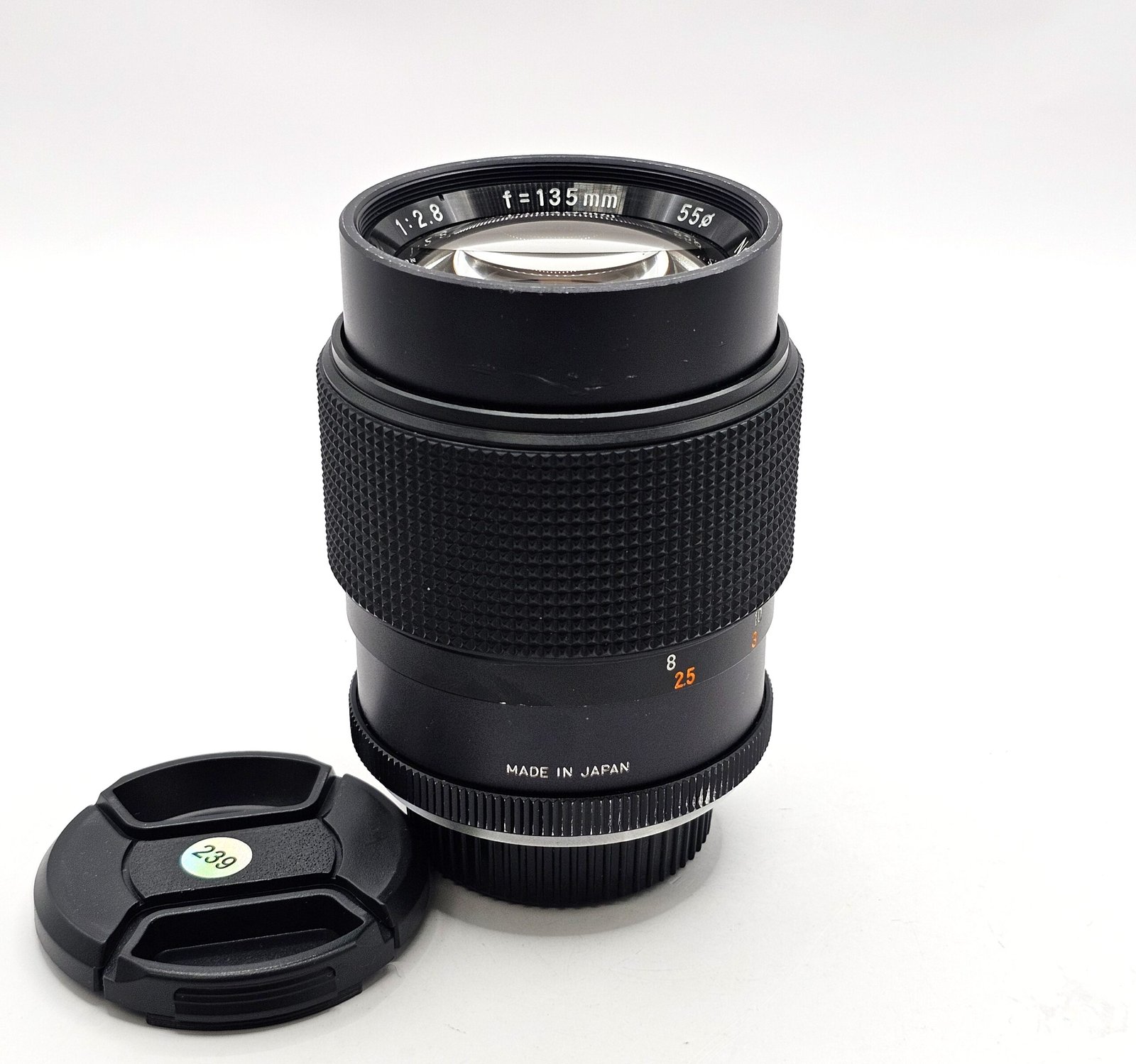 Longitud focal: 135 mm, con apertura máxima de f/2.3 y mínima de f/22